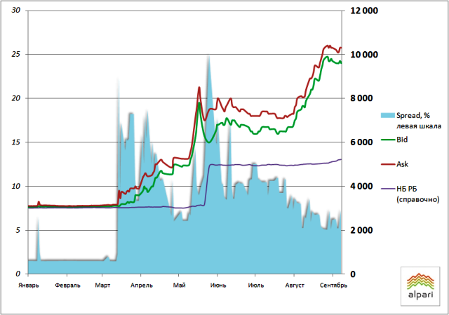 Стоимость доллара США в белорусских рублях на межбанковском рынке, на основе котировок Rietumu Banka. Правая шкала – курсы покупки и продажи, левая шкала – спред (разница между продажей и покупкой) в процентах.