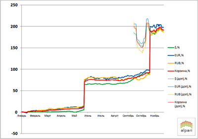 Всего с начала года доллар подорожал на 191,33%, евро на 197,54%, а российский рубль на 187,48%. Валютная корзина прибавила с начала года 192,09%.