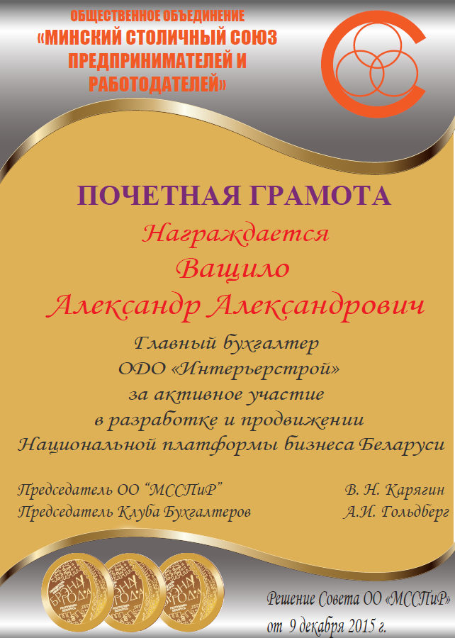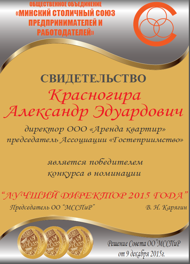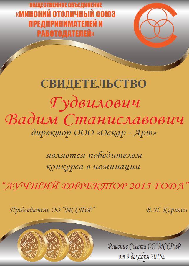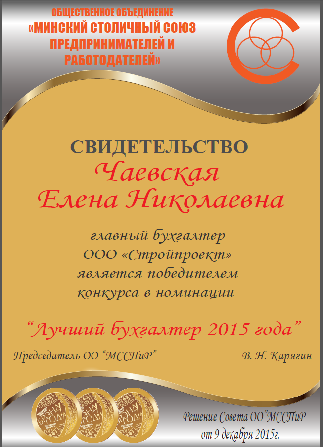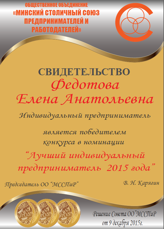 По многолетней традиции Минский столичный союз предпринимателей и работодателей в честь уходящего года проводит конкурс среди своих членов. В рамках конкурса определяются победители в номинациях "Лучший директор", "Лучший бухгалтер", "Деловая женщина", "Лучший индивидуальный предприниматель". Кто вошёл в число победителей «Выбор года-2015»? Ответ см. здесь: